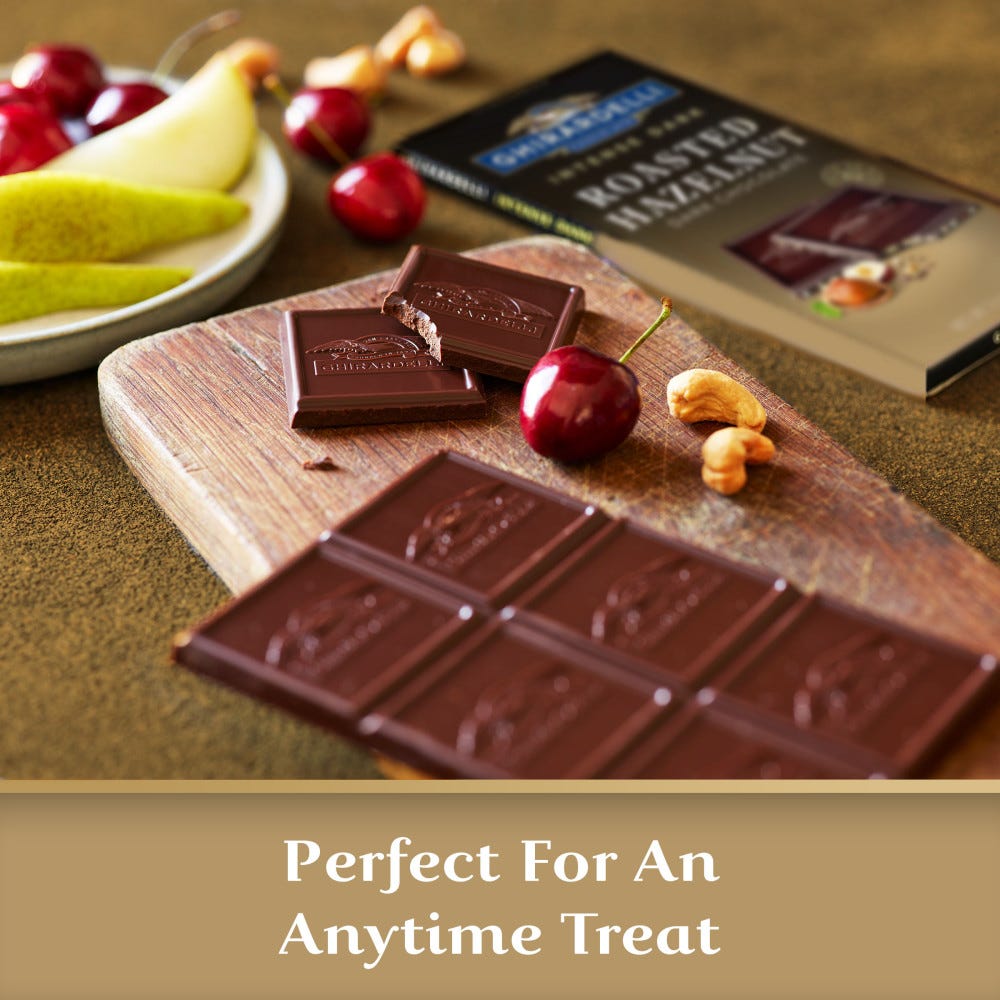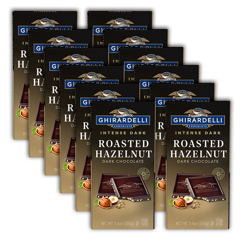 - Intensely delicious dark chocolate squares with subtle flavors of roasted hazelnut pieces