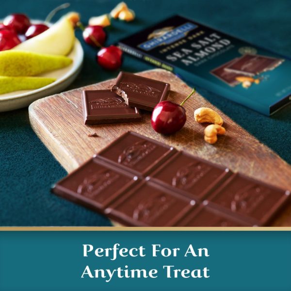 Enjoy a decadent experience with GHIRARDELLI Intense Dark Sea Salt Almond Dark Chocolate Bars. This case of 12 dark chocolate bars is crafted with high-quality cocoa beans and skillfully blended with roasted almonds and sea salt for an irresistible combination of salty and sweet. Each intensely delicious square caters to your senses and perfect for after dinner treat!